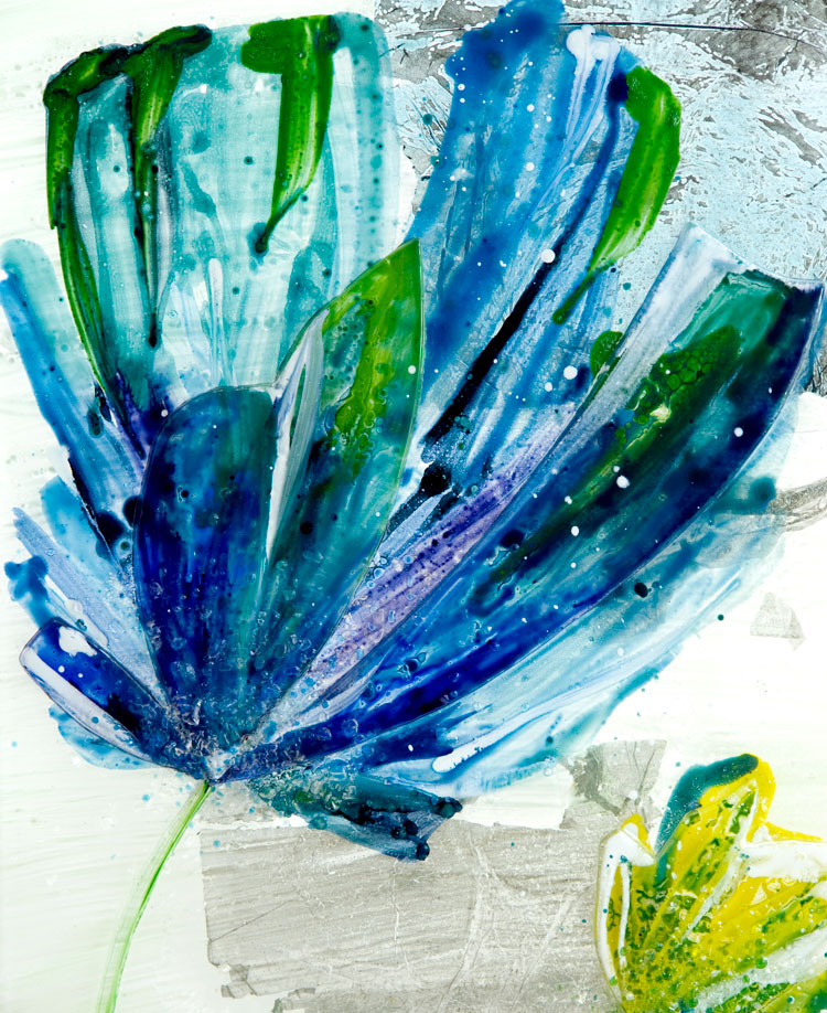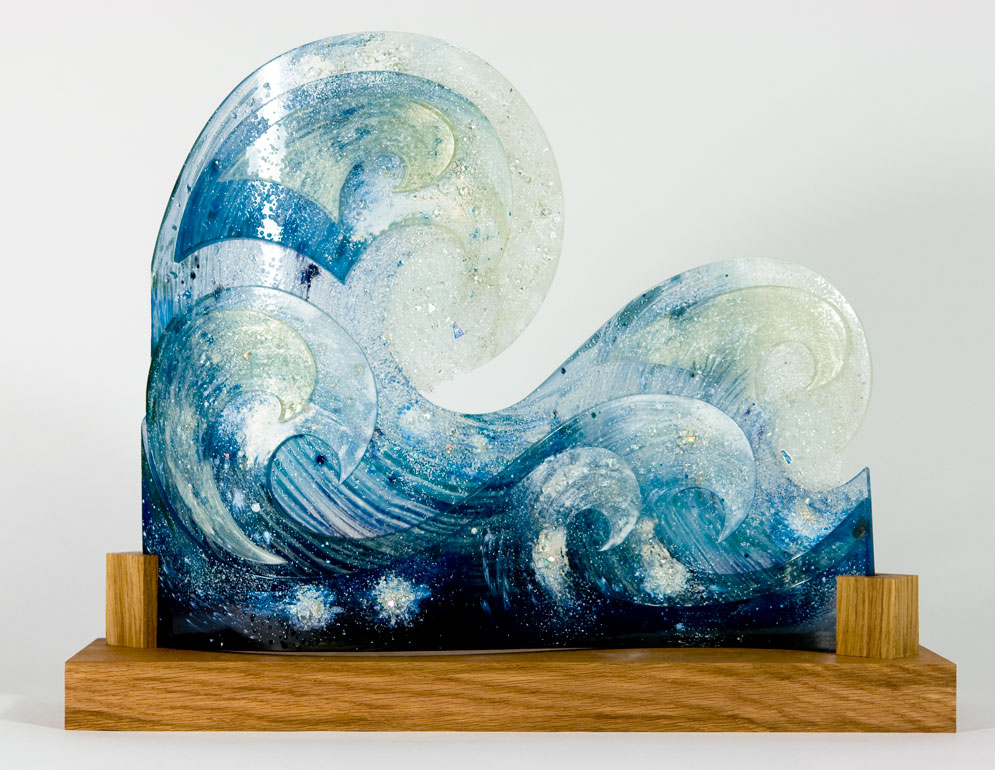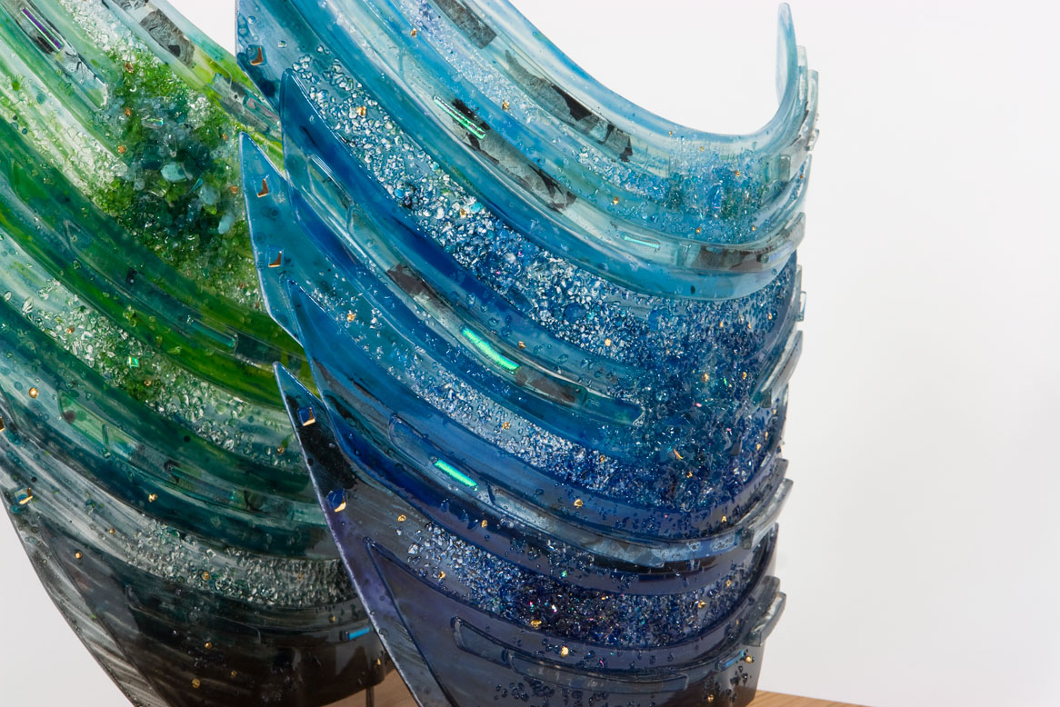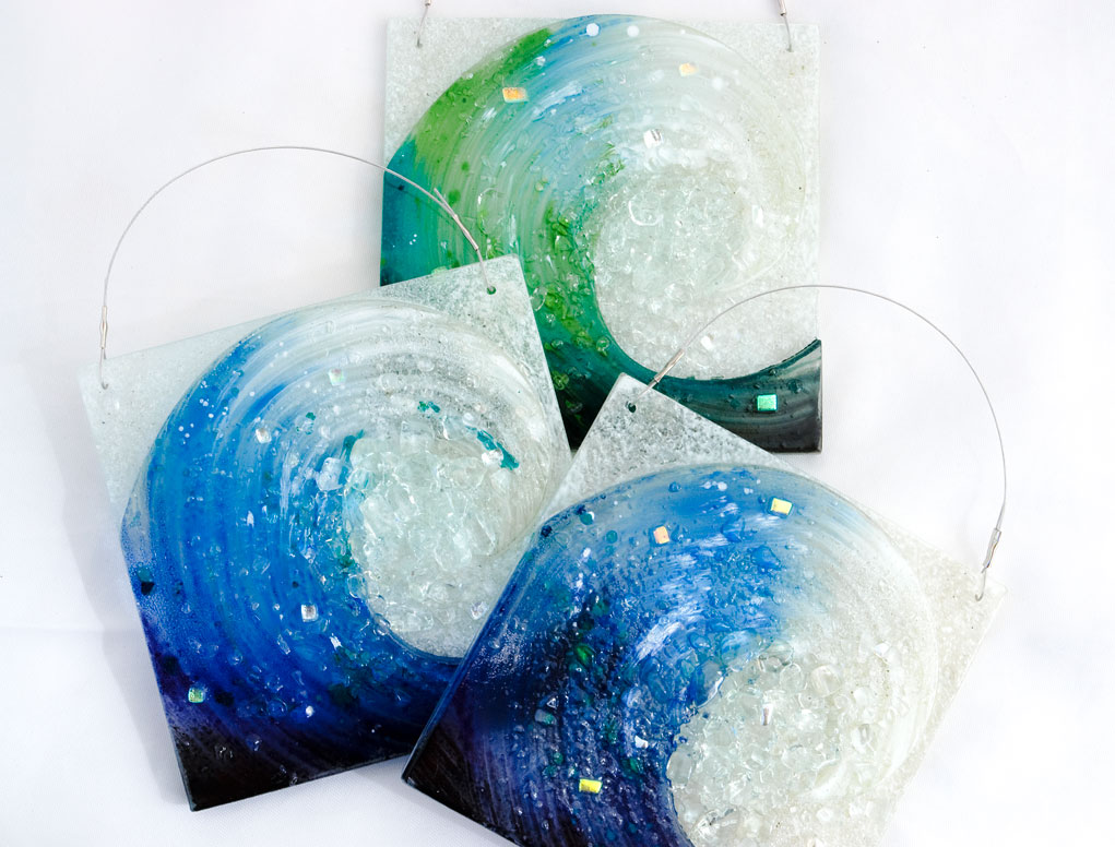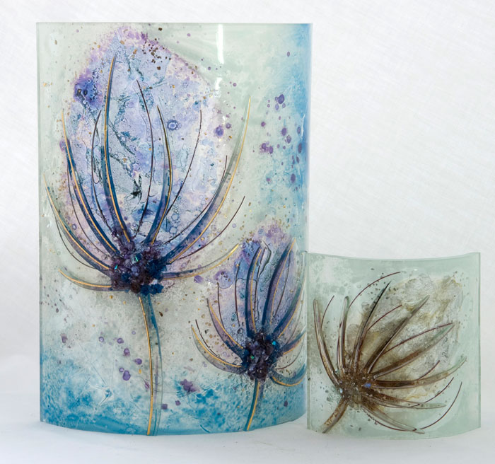 with enamels, tack fused and slumped into curves, with highlights of dichroic glass.