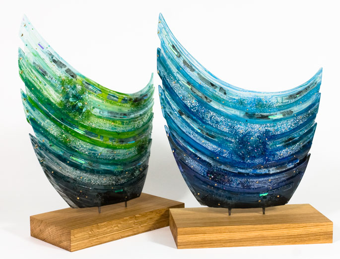 and finished with dichroic highlights. There are wall panels, shoals and some individual pieces are mounted onto oak bases.