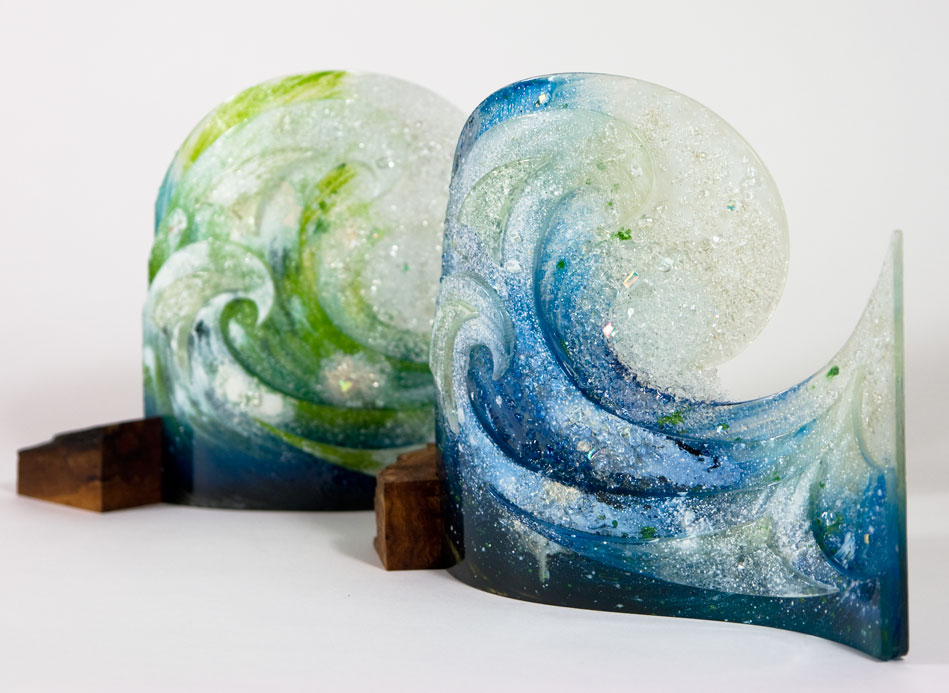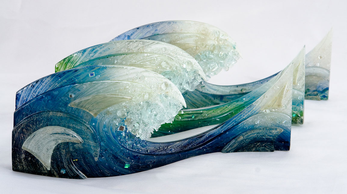 Pieces include - large curved wave on oak base, medium wave with bur elm, small curved wave and wave plaques. Also