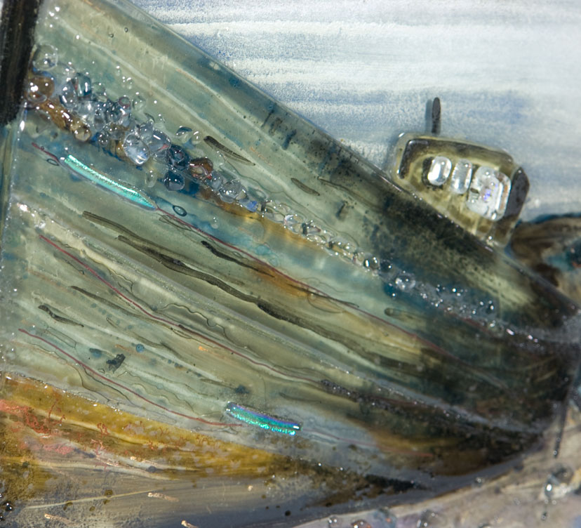 Each boat is hand painted and made out of overlaying strips of glass to give the impression of the planks. Crushed glass (frit) and metal leaf including dichroic